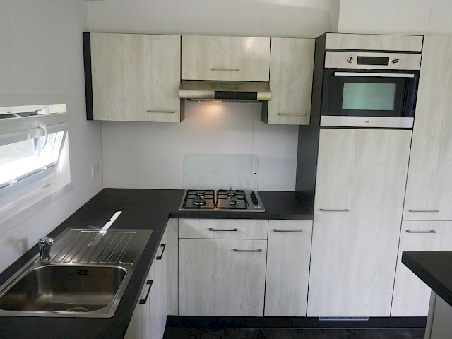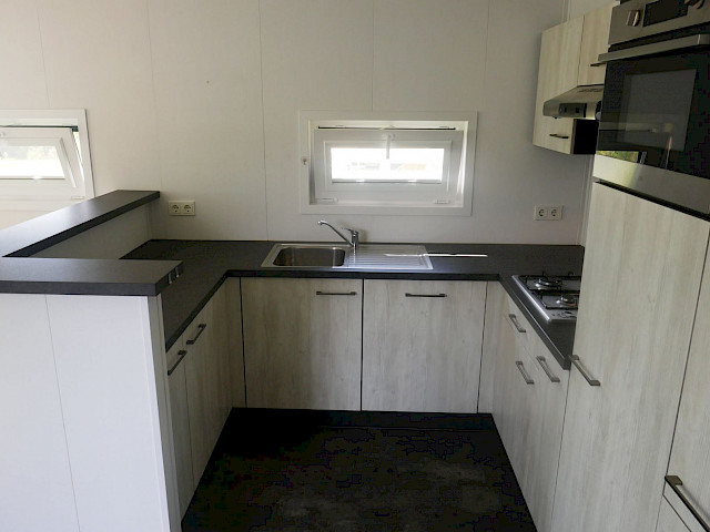 Es hat einen schönen Wohnbereich mit einer schönen U Küche, diese ist mit einem großen Kühlschrank mit Gefrierfach, Mikrowelle, 4-Flammen-Herd und Geschirrspüler ausgestattet.