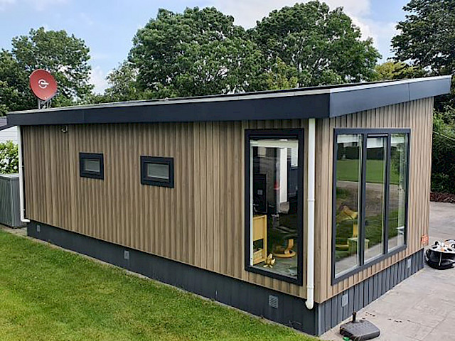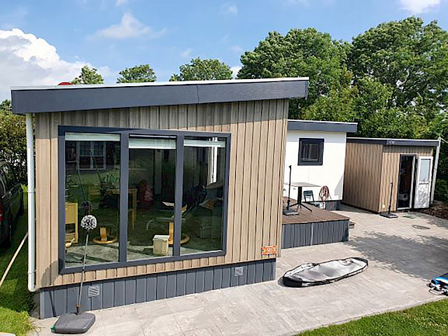 Dieses schöne Modell Da Vinci L mit Gartenhaus ist zu verkaufen (ohne Stellplatz). Das Chalet mit Pultdach ist mit einer Vinylplus-Außenverkleidung in Holzoptik in Kombination mit anthrazitfarbenen Fensterrahmen ausgestattet.