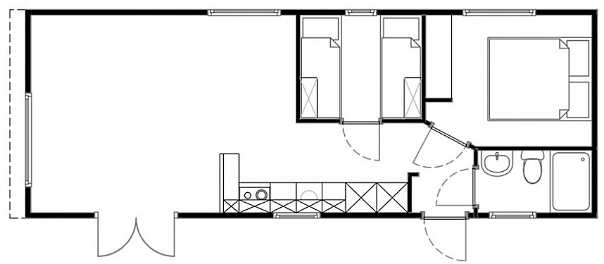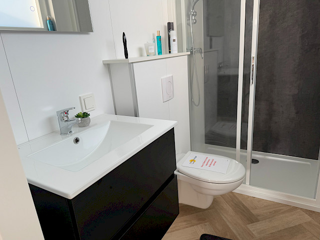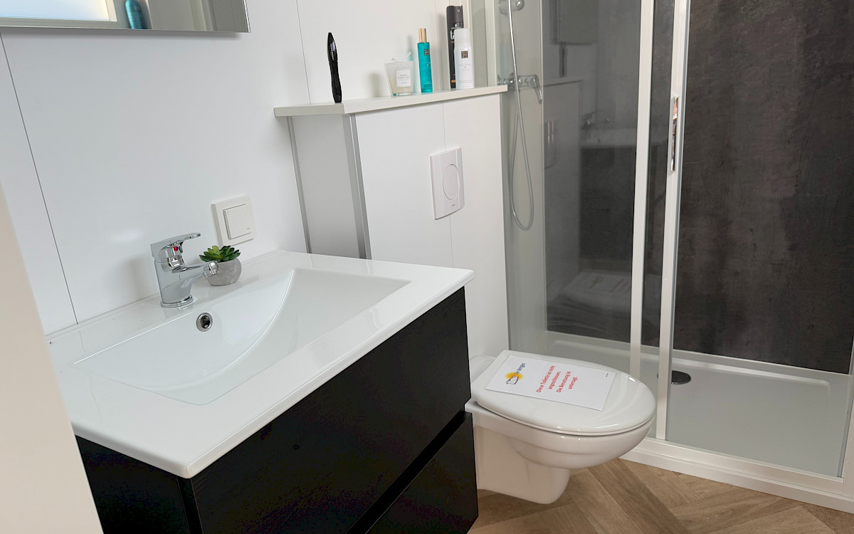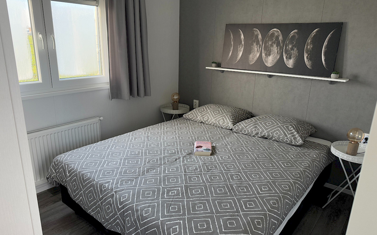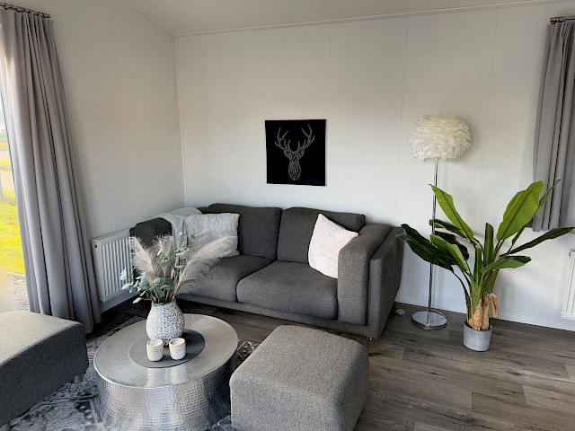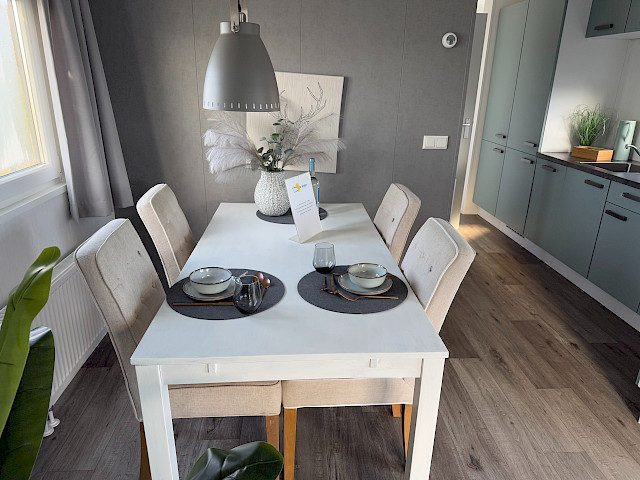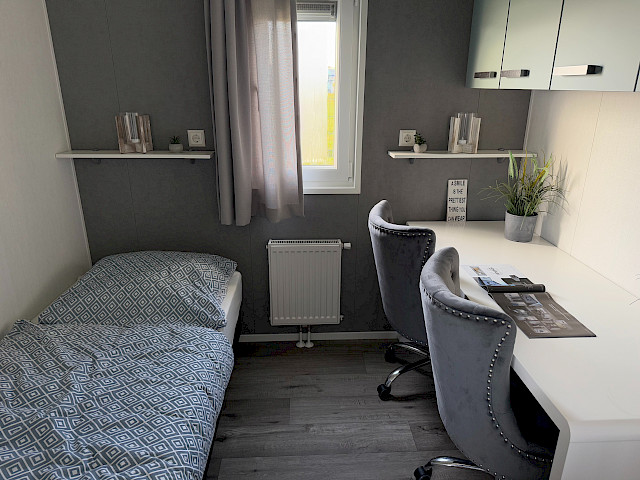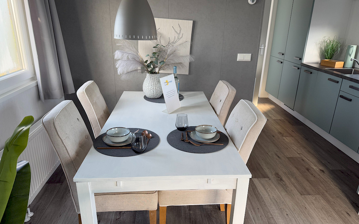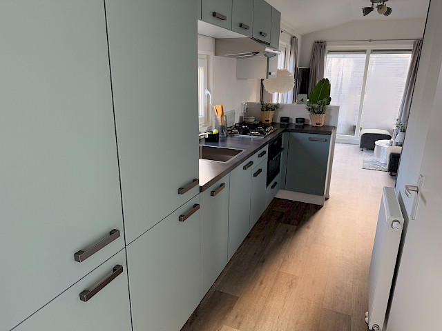 De Bergjes Everest unterscheidet sich etwas von den Standardmodellen, da seine Fenster nicht mittig angeordnet sind. Die Geräumigkeit des Wohnzimmers und die frische Ausstrahlung werden von vielen luxuriösen Details in der Küche begleitet; denken Sie an einen integrierten Geschirrspüler, einen Luxusherd mit Backofen/Grill und eine kleine Bar. Die schönen Akzentwände im Chalet machen es komplett!
