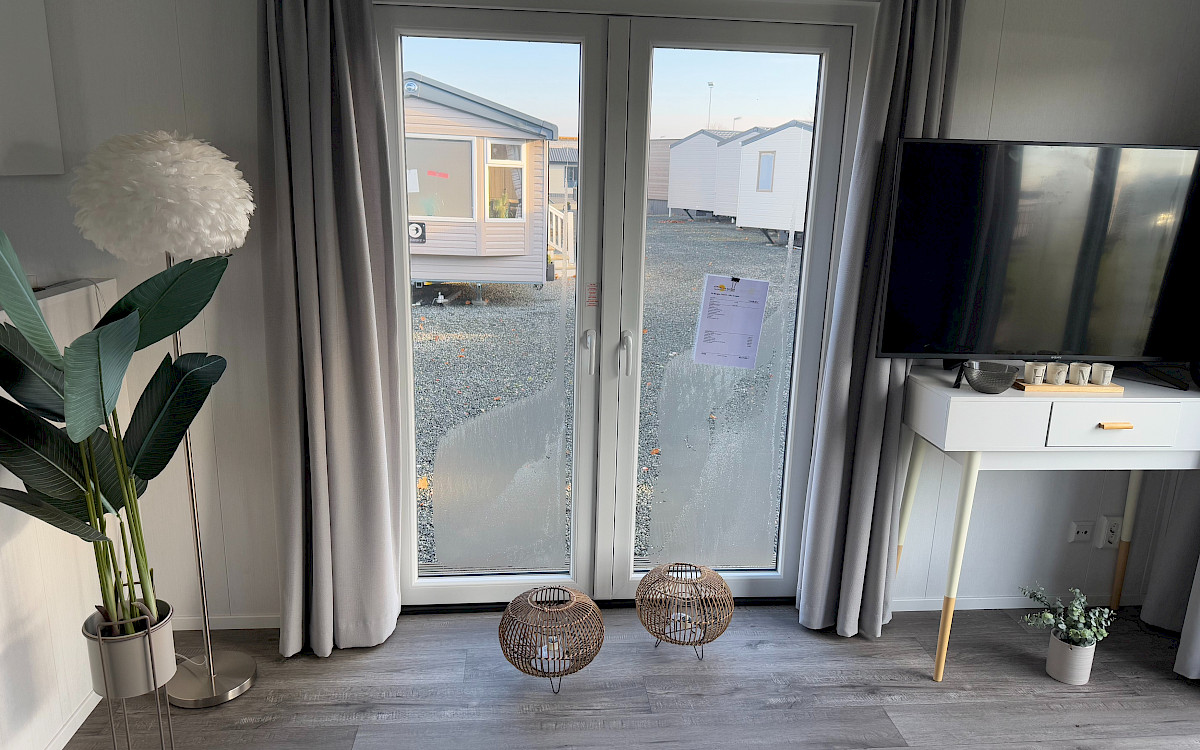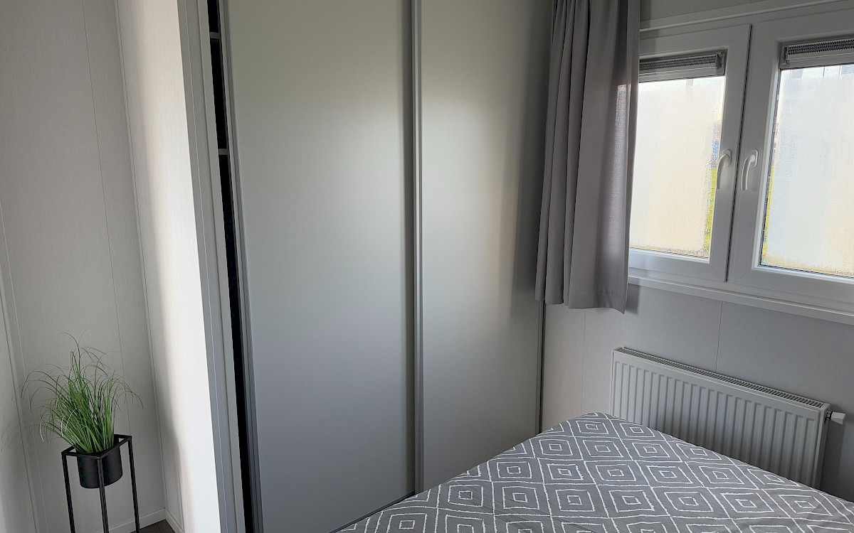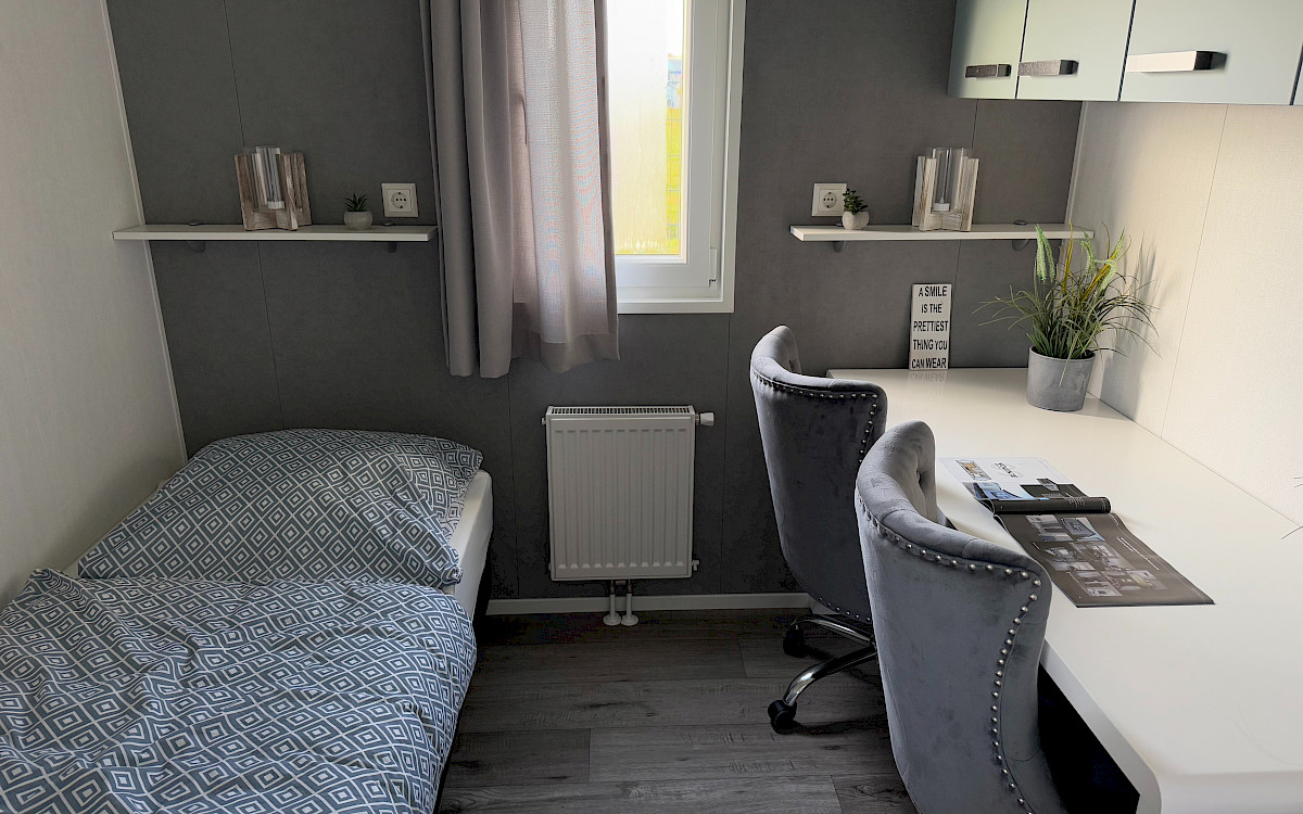 Auf den obigen Abbildungen ist das folgende Modell zu sehen: 1100 x 400 – 2 Schlafzimmer mit folgenden Optionen: Vorhänge, Geschirrspüler, anthrazitfarbene Fensterrahmen, anthrazitfarbene Dachrinne und Fallrohre sowie eine anthrazitfarbene Boje.