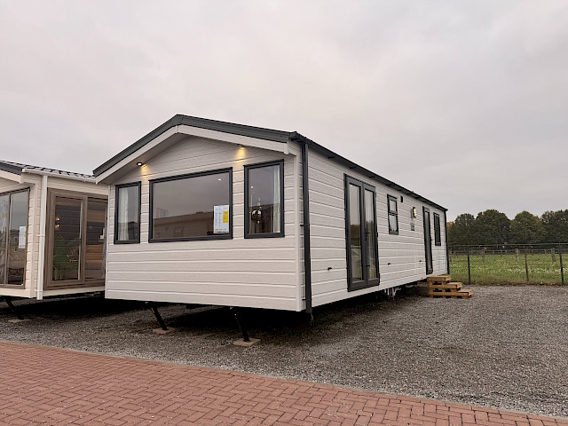 Auf dem obigen Bild ist das folgende Modell zu sehen: 1100 x 400 – 2 Schlafzimmer. Mit folgenden Optionen: Luxusherd mit Backofen und Grill, Regenrinne in anderer Farbe, Fensterrahmen und Türen in anderer Farbe und erweitertes Zusatzisolierungspaket.