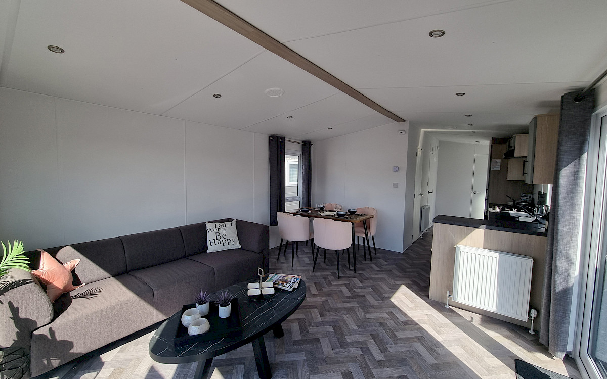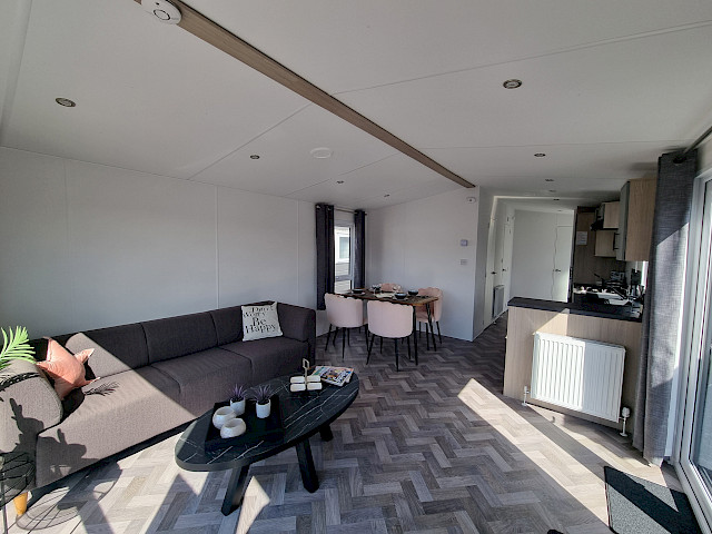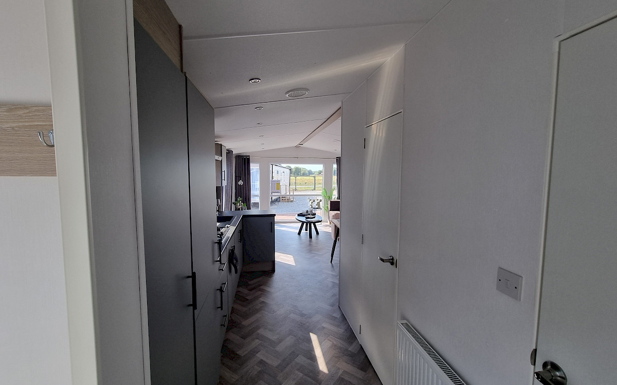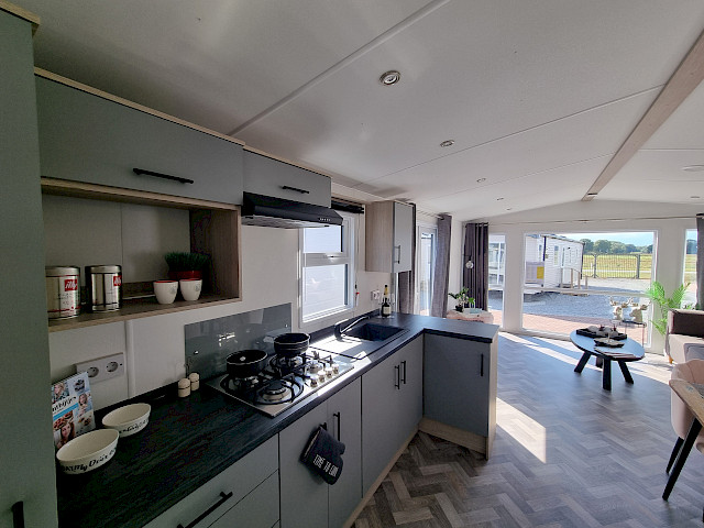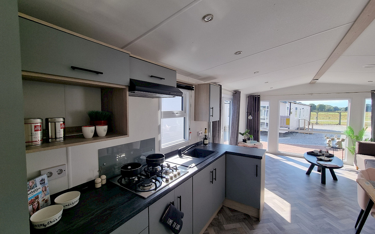Dieses schöne Mobilheim bietet einen geräumigen Eingangsbereich, in dem Sie mühelos Mäntel und Taschen aufhängen können. Der großzügige Eingang vermittelt sofort ein Gefühl von Raum und Gastfreundschaft, so dass Sie sich sofort wie zu Hause fühlen. Der Ocean Super Plus verfügt über eine moderne U-förmige Küche mit Herd, Dunstabzugshaube, eingebautem Kühlschrank und Gefrierschrank. Es gibt sogar Platz für eine Mikrowelle und die Möglichkeit, einen Geschirrspüler hinzuzufügen, so dass Sie komplett ausgestattet sind.