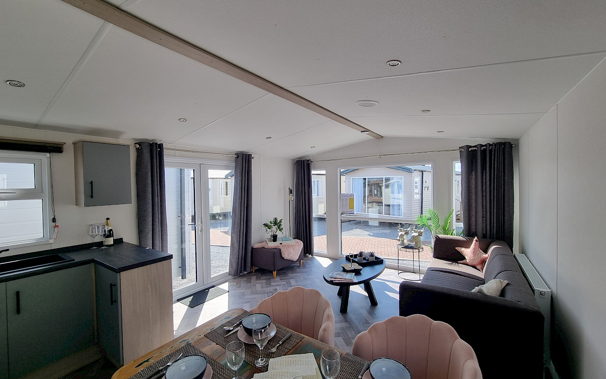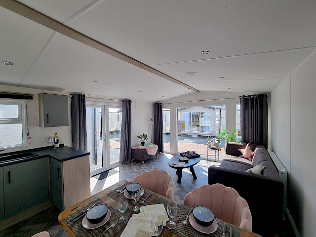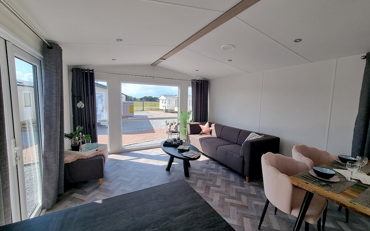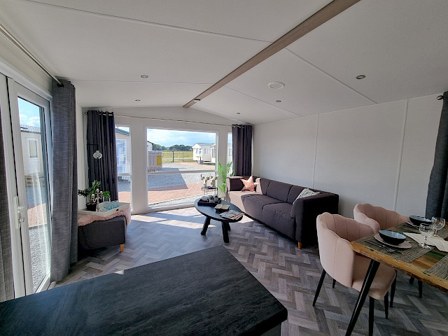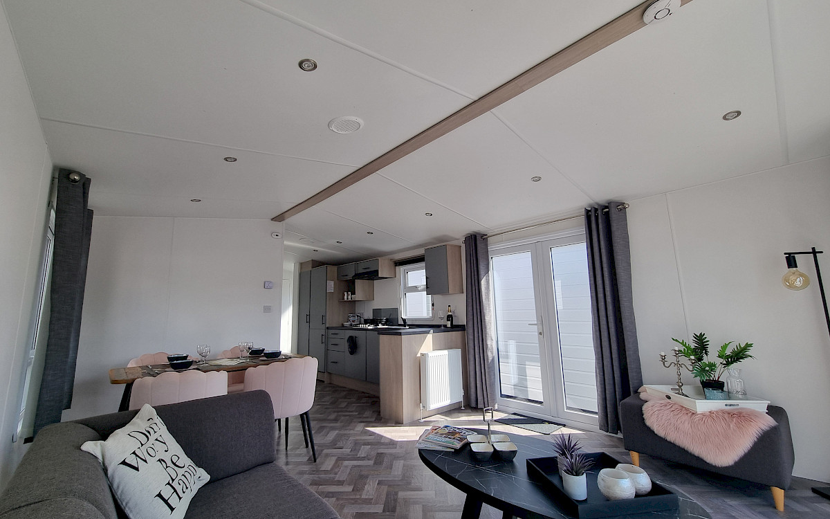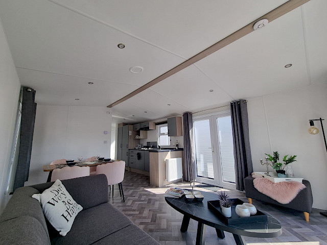 Dieses schöne Mobilheim bietet einen geräumigen Eingangsbereich, in dem Sie mühelos Mäntel und Taschen aufhängen können. Der großzügige Eingang vermittelt sofort ein Gefühl von Raum und Gastfreundschaft, so dass Sie sich sofort wie zu Hause fühlen. Der Ocean Super Plus verfügt über eine moderne U-förmige Küche mit Herd, Dunstabzugshaube, eingebautem Kühlschrank und Gefrierschrank. Es gibt sogar Platz für eine Mikrowelle und die Möglichkeit, einen Geschirrspüler hinzuzufügen, so dass Sie komplett ausgestattet sind.