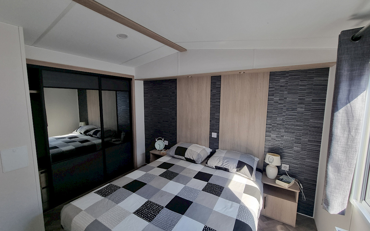 Auf dem obigen Bild ist das folgende Modell abgebildet: 1100 x 400 – 2 Schlafzimmer. Mit folgenden Optionen: Fliegengitter, zusätzliche Steckdose, Dämmungspaket, Außensteckdose, deutsche Gasnorm und anthrazitfarbene Fensterrahmen.
