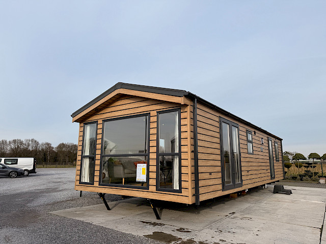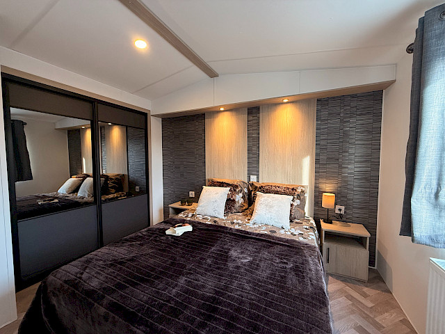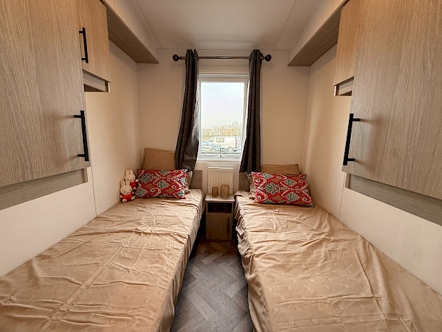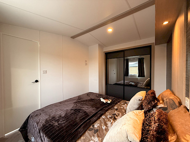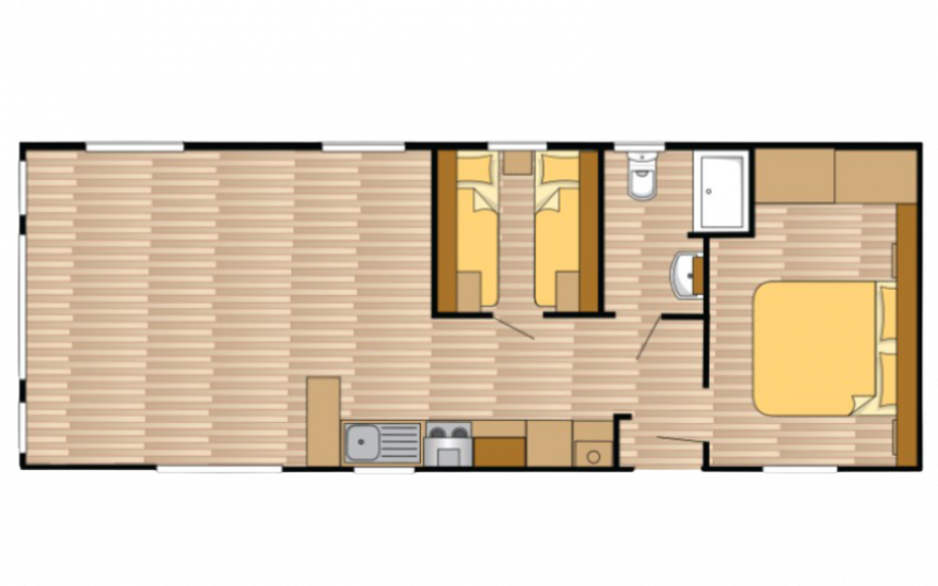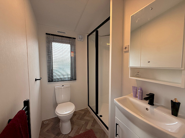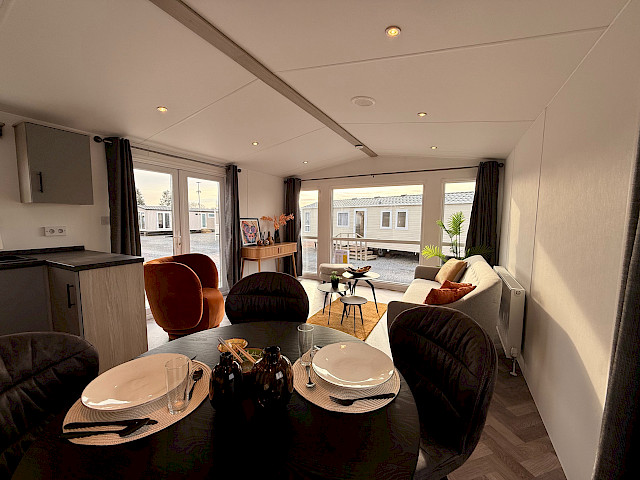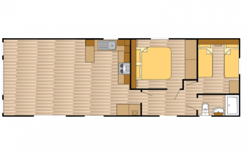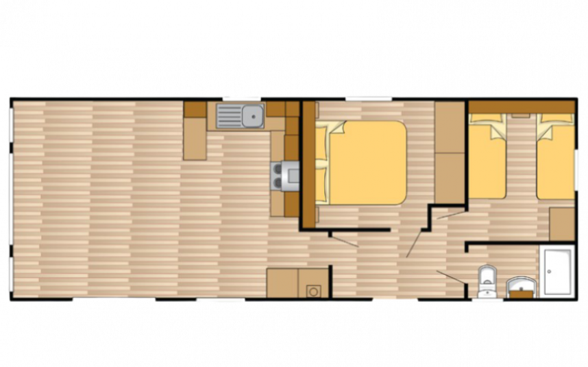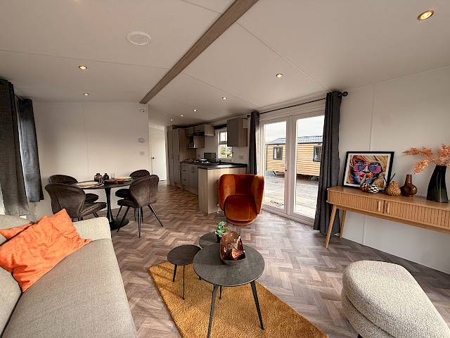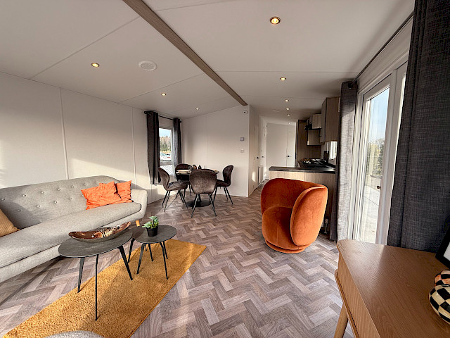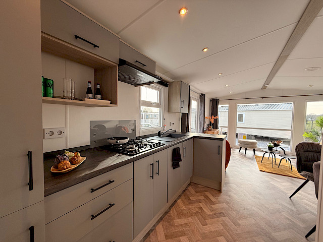 Das Mobilheim Ocean bietet alles, was Sie für einen komfortablen Aufenthalt benötigen. Die großen Fenster und Terrassentüren sorgen für viel Tageslicht und einen nahtlosen Übergang nach draußen. Der stilvolle Vinylbodenbelag im Fischgrätenmuster verleiht dem Raum ein modernes und warmes Ambiente. Die L-förmige Küche mit eleganten schwarzen Akzenten ist mit einem 4-Flammen-Herd und einer eingebauten Kühl-/Gefrierkombination ausgestattet. Darüber hinaus bietet das Modell Ocean zwei Schlafzimmer mit ausreichend Stauraum und ein Badezimmer mit einer geräumigen Duschkabine und einer Toilette.
