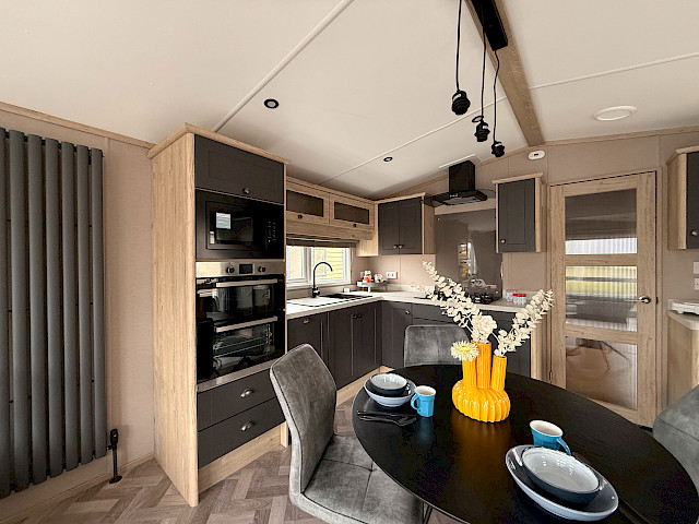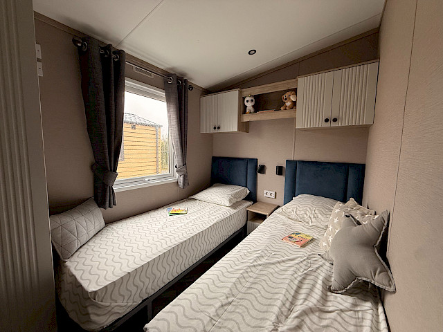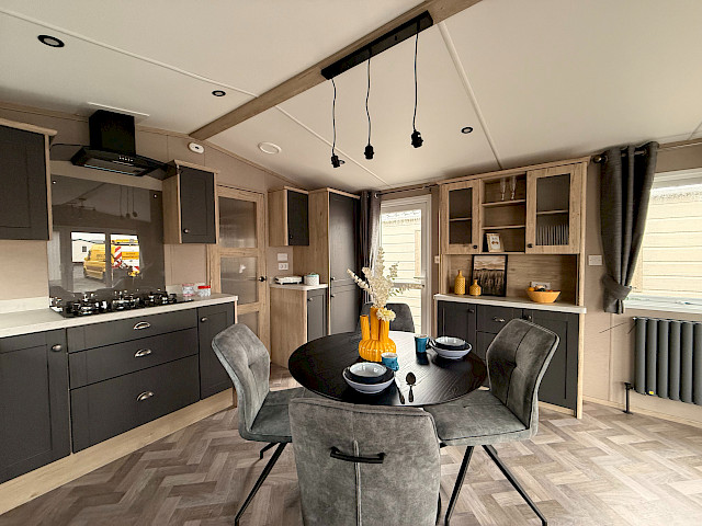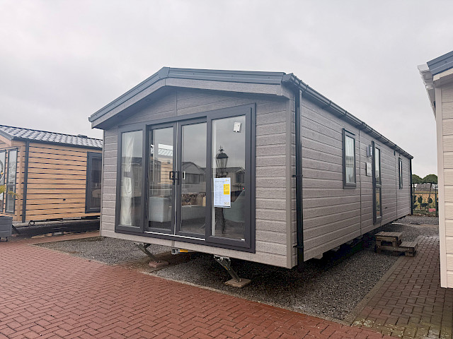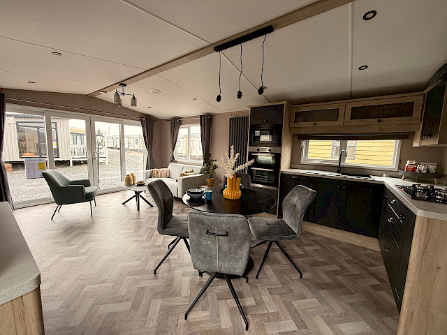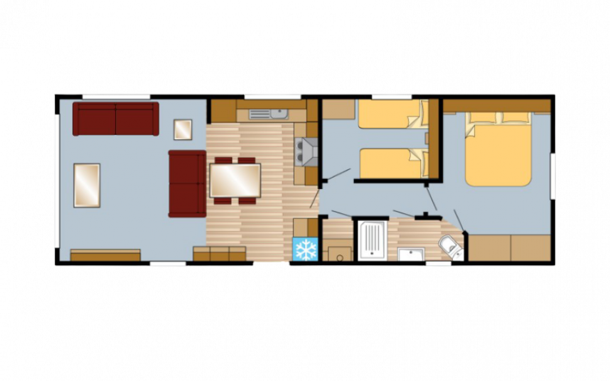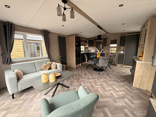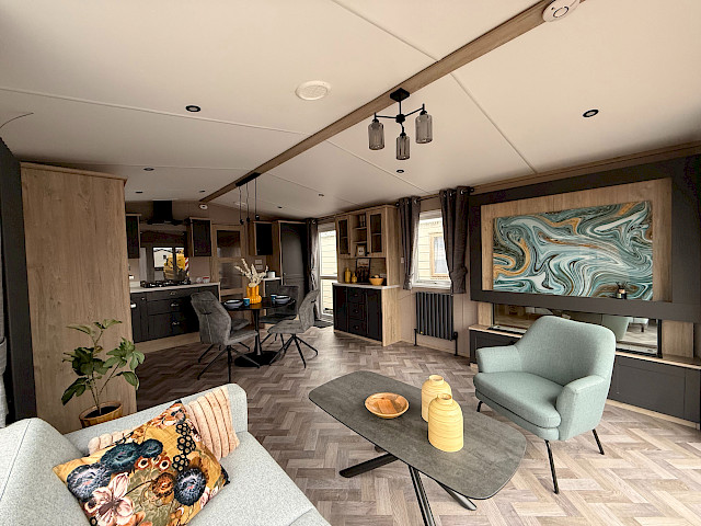 Lernen Sie die Bergjes Serie Redwood kennen: unser Spitzenmodell, das Luxus, Geräumigkeit und Wärme in einem durchdachten Mobilheim vereint. Der offene Grundriss mit Schiebetüren, Vinylboden, durchgehender Decke und elektrischem Kamin schafft einen modernen, einladenden Wohnraum, in dem man sich sofort wie zu Hause fühlt. Die voll ausgestattete L-förmige Küche – einschließlich integriertem Backofen, Mikrowelle, Geschirrspüler und Kühl-Gefrierkombination – macht das Kochen jeden Tag zum Vergnügen. Mit zwei Schlafzimmern, darunter ein großzügiges Hauptschlafzimmer mit eigenem Bad, genießen Sie höchsten Komfort. Das Modell ist unmöbliert, aber mit Vorhängen ausgestattet, sodass Sie es ganz nach Ihrem Geschmack einrichten können.