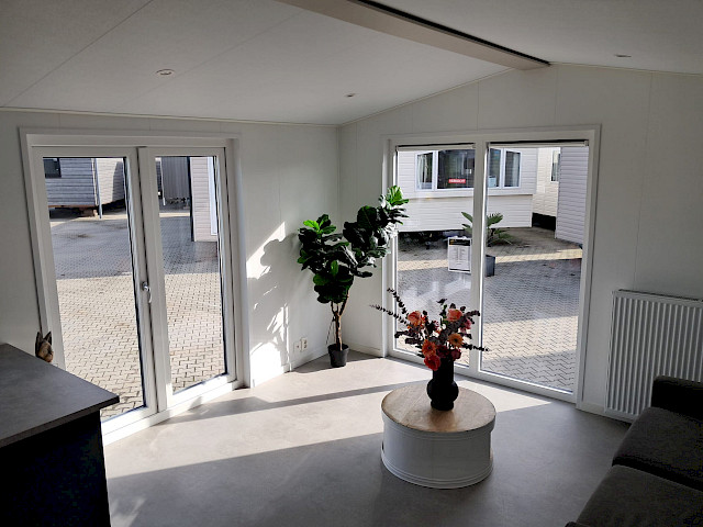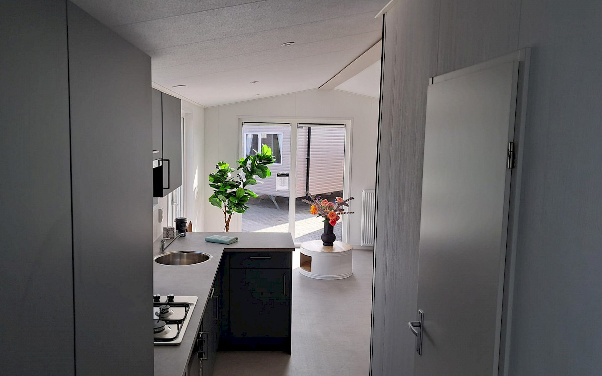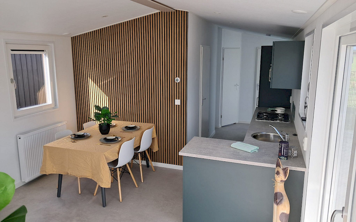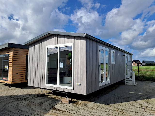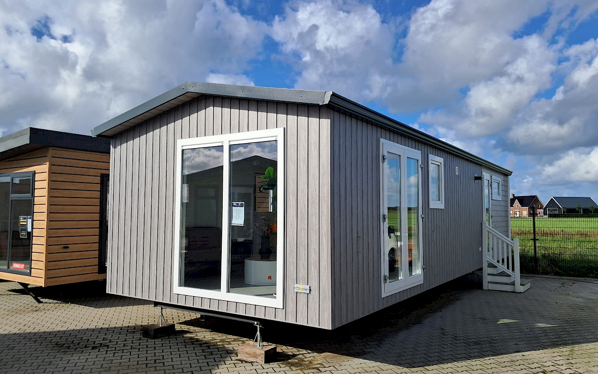 Dieses neue Chalet-Modell aus der Volente-Serie besticht durch sein wunderschönes Satteldach mit durchgehender Decke, das für ein großzügiges Raumgefühl und viel natürliches Licht sorgt. Die Außenfassade ist mit VinylPlus-Verkleidung versehen, was zu einem modernen, klaren Erscheinungsbild beiträgt.