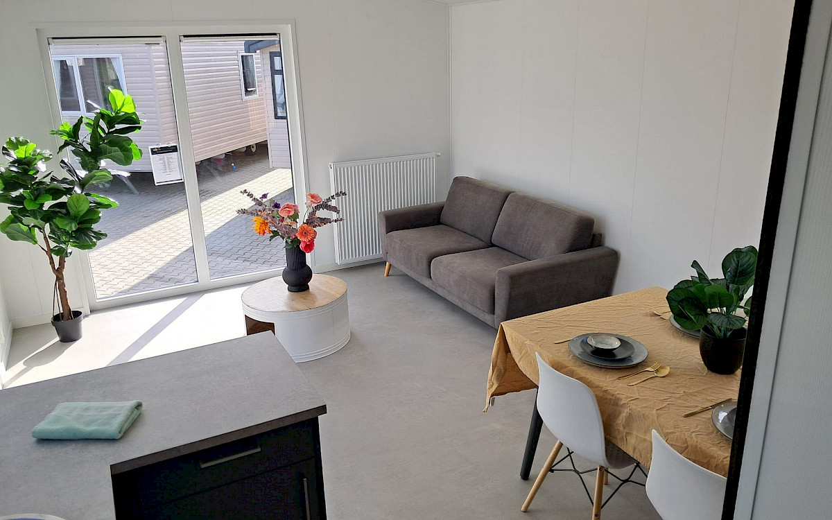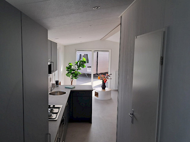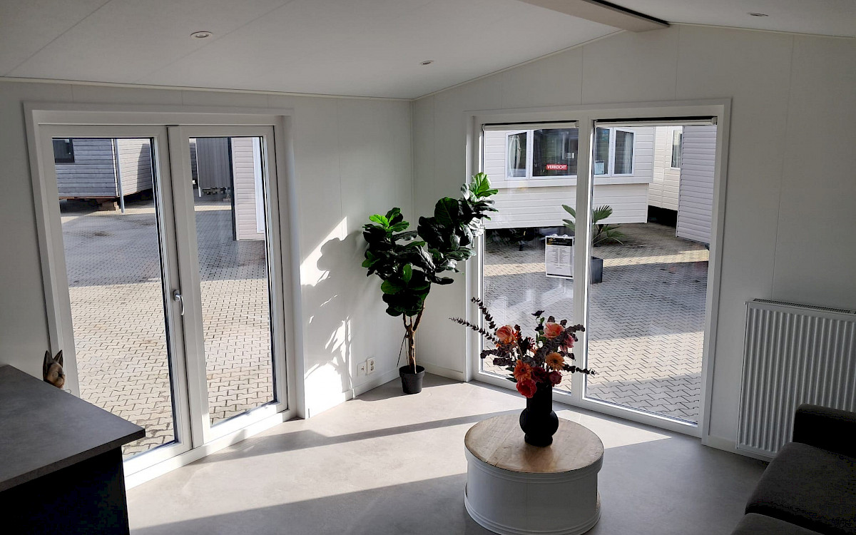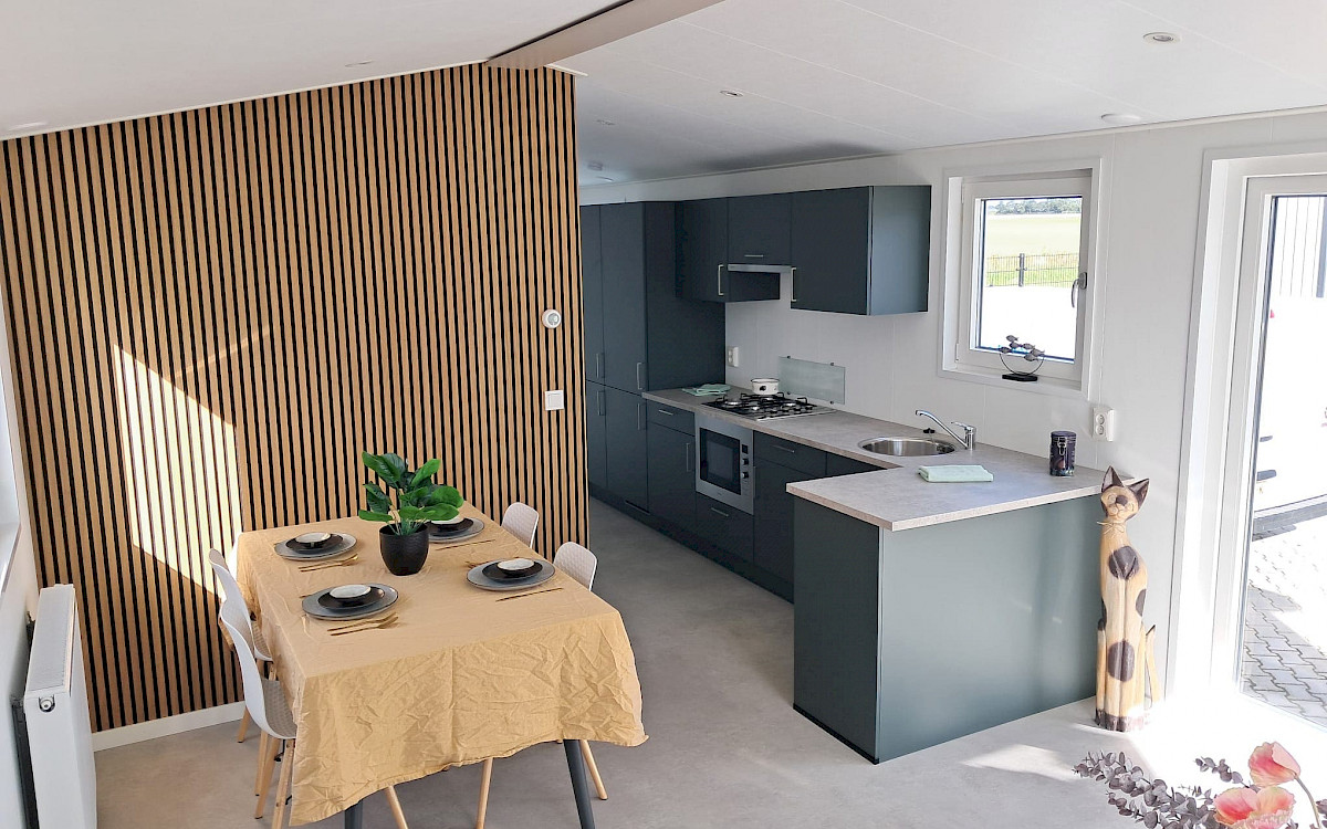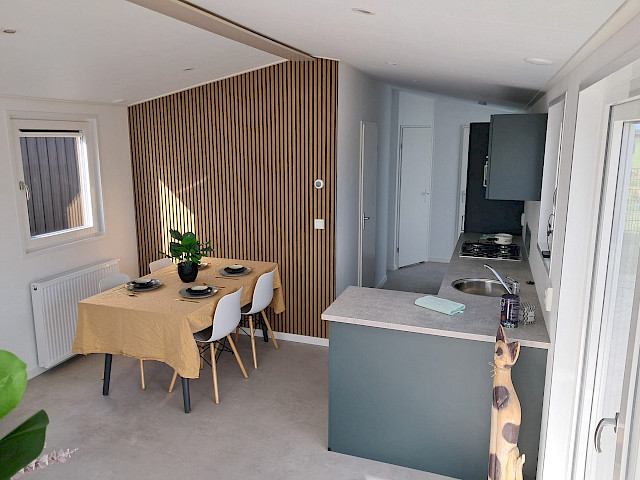 Dieses neue Chalet-Modell aus der Volente-Serie besticht durch sein wunderschönes Satteldach mit durchgehender Decke, das für ein großzügiges Raumgefühl und viel natürliches Licht sorgt. Die Außenfassade ist mit VinylPlus-Verkleidung versehen, was zu einem modernen, klaren Erscheinungsbild beiträgt.