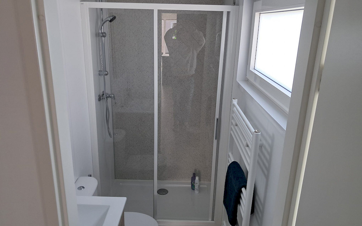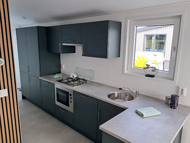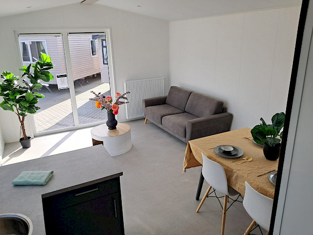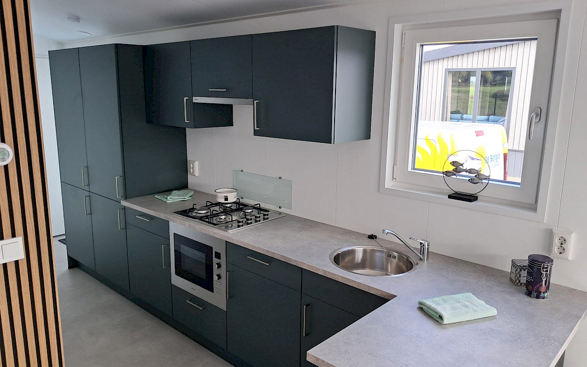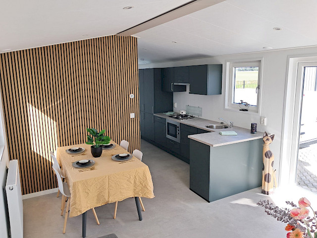 Im Inneren finden Sie eine großzügige Küche, die komplett mit modernen Geräten und ausreichend Stauraum ausgestattet ist. Die großen, bis zum Boden reichenden Frontfenster bieten einen Panoramablick und einen wunderschönen Lichteinfall.
