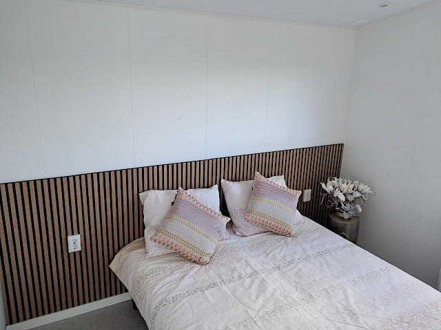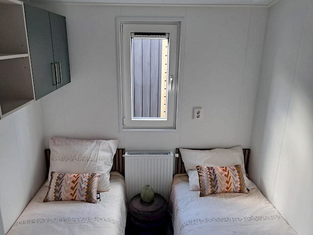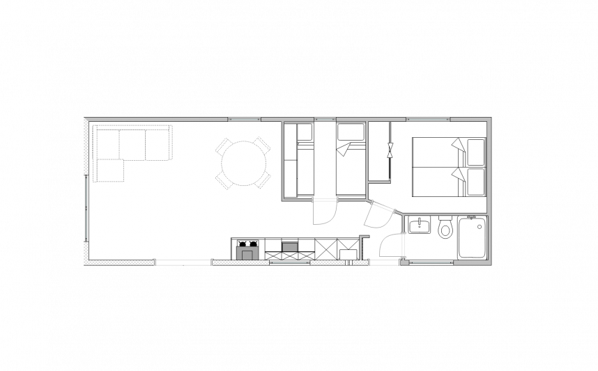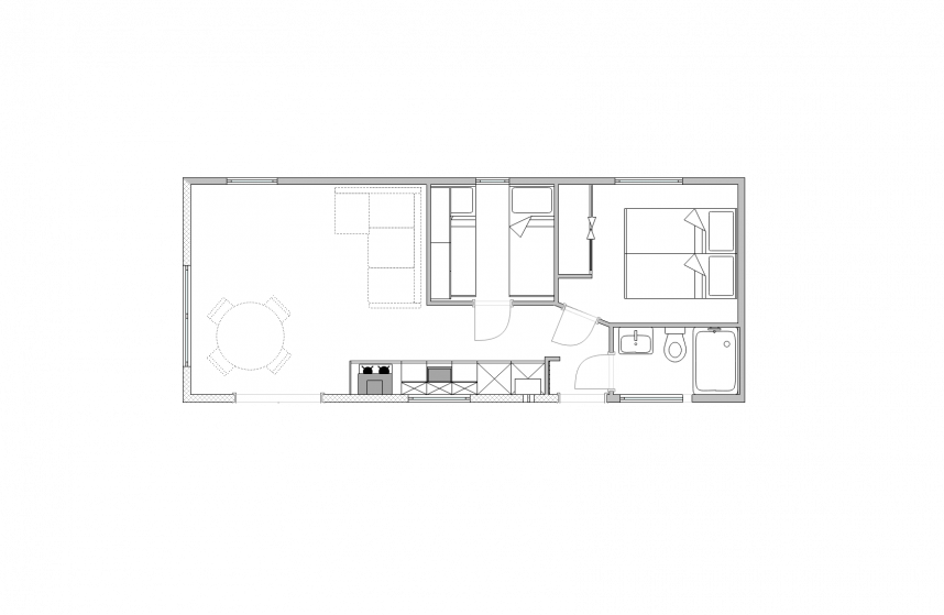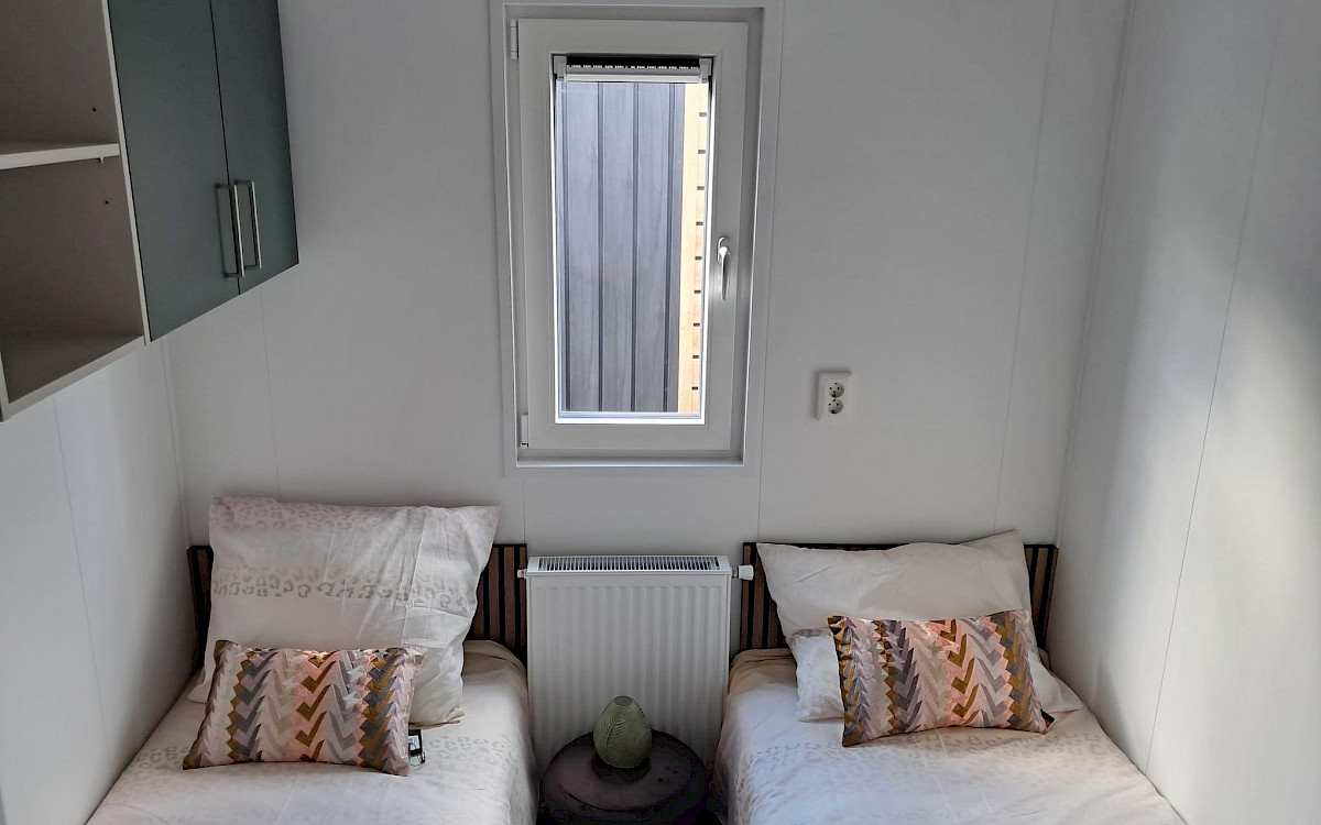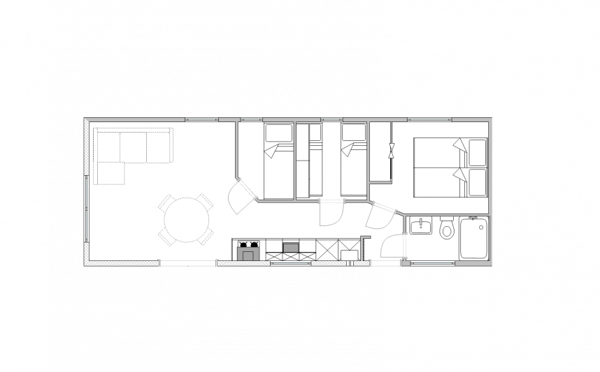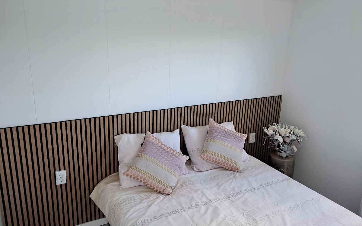 Auf den obigen Bildern ist das folgende Modell zu sehen: 1100 x 400 – 2 Schlafzimmer mit folgender Option: Akzentwand und L-förmige Küche. Gesamtpreis: €81.209.