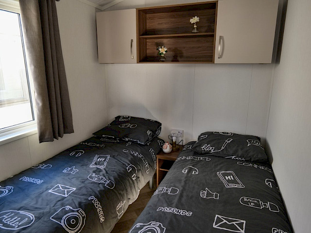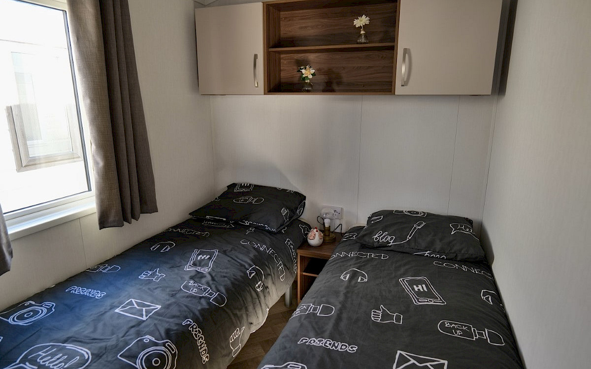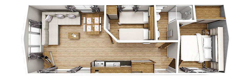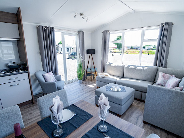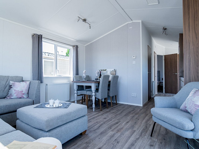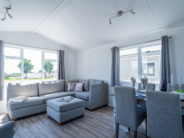 Wenn Sie sich für das Willerby Lumic-Möbelpaket entscheiden, erhalten Sie graue Vorhänge in den Schlafzimmern, bunte Vorhänge im Wohnzimmer, einen Esstisch mit 4 Stühlen, ein Schlafsofa, einen Hocker, einen Fernsehschrank, einen Couchtisch und ein Bettgestell im Hauptschlafzimmer.