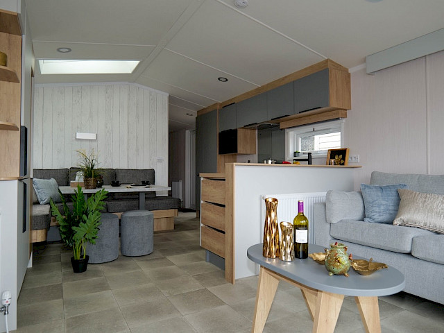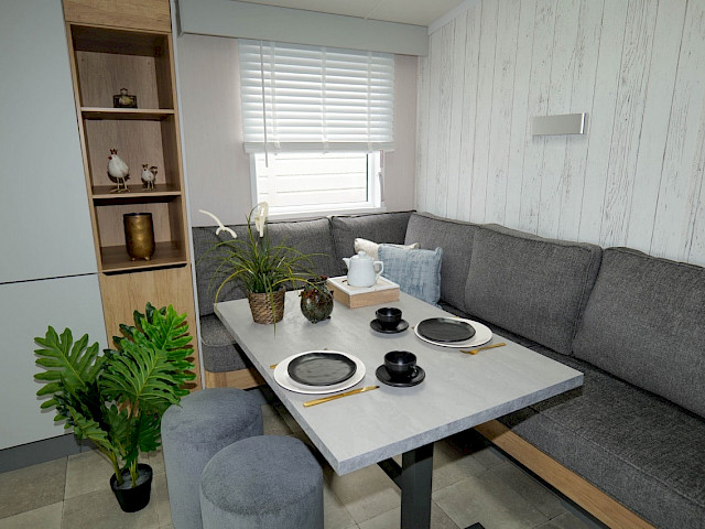 Der Luxus des Swift Moselle ist sehr beeindruckend. Dieses Chalet wurde mit Blick auf die Zweisamkeit entworfen und verfügt über eine offene Küche mit einem Esszimmer für gemütliche Abendessen. Die großen Fenster des gemütlichen Wohnzimmers bieten die beste Aussicht auf die Umgebung. Das Swift Moselle Lodge wird nach den Vorgaben des Wohnungsbaus gebaut, ist sehr gut isoliert und verfügt über spezielles Wärmeschutzglas. Im Inneren dieses Ferienhauses finden Sie Luxus und viele Möglichkeiten. Die reichhaltig ausgestattete Küche mit schwarzen Details verfügt unter anderem über einen integrierten Geschirrspüler, Waschmachine und eine Mikrowelle. Im Wohnzimmer finden Sie einen gemütlichen Kamin und eine Bluetooth-MP3-Anlage, die es besonders gemütlich macht.