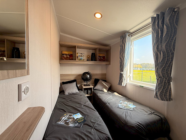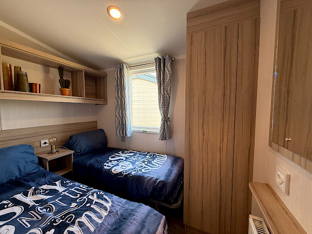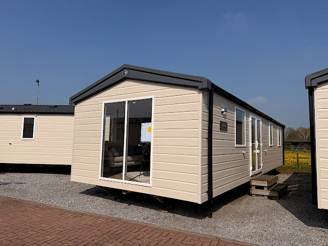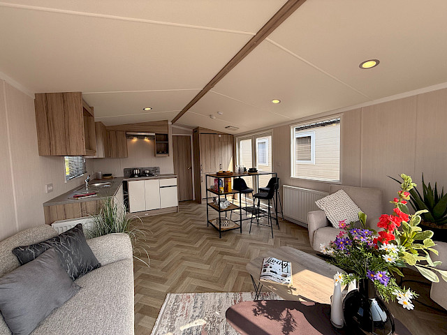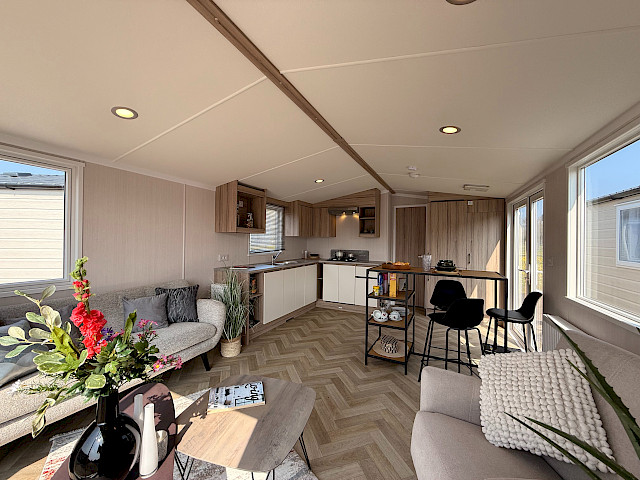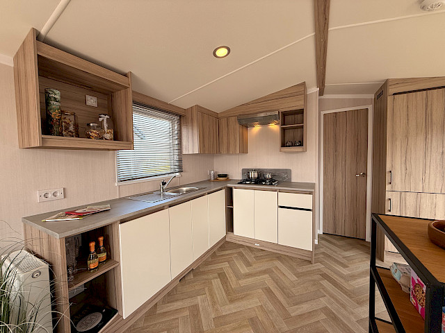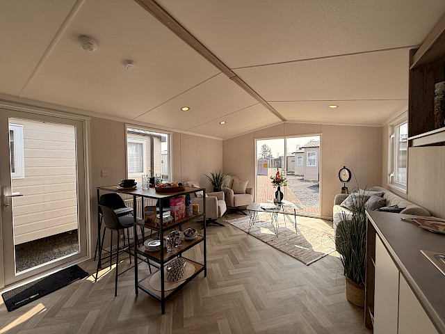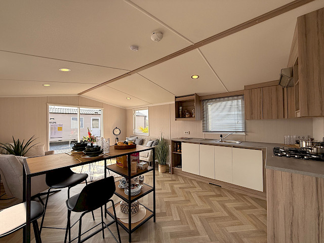 Der Swift Royan Special verbindet ein frisches, modernes Erscheinungsbild mit einer Kunststoffverkleidung, großen Fensterfronten und doppelten Terrassentüren für optimale Lichtdurchflutung. Im Innenbereich sorgt ein moderner PVC-Fischgrätenboden für eine luxuriöse und zeitgemäße Atmosphäre. Die geräumige L-förmige Küche ist mit einem Gasherd und einer Kühl-Gefrierkombination ausgestattet. Das Mobilheim verfügt über zwei Schlafzimmer und ein Badezimmer mit Dusche und WC. Im gesamten Mobilheim sorgen LED-Spots für eine moderne, stimmungsvolle Beleuchtung. Da dieses Royan Special unmöbliert geliefert wird, können Sie es ganz nach Ihrem eigenen Geschmack und Stil einrichten.
