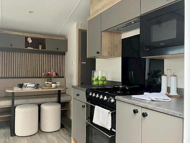 Der Willerby Rio ist ein modernes und stilvolles Mobilheim, das Komfort und Funktionalität perfekt vereint. Durch die durchdachte Raumaufteilung wirkt der Innenraum offen und einladend, mit einem hellen Wohnzimmer, einer großzügigen Eckcouch und großen Fenstern, die viel Tageslicht hereinlassen. Die Küche ist praktisch gestaltet, mit modernen Geräten und viel Stauraum, während der Essbereich ideal für gemütliche Momente mit Familie oder Freunden ist. In den zwei Schlafzimmern genießen Sie Ruhe und Komfort – das Hauptschlafzimmer bietet viel Stauraum, und das zweite Schlafzimmer eignet sich perfekt für Gäste oder Kinder. Der Willerby Rio ist die stilvolle und erschwingliche Lösung für alle, die ein entspanntes zweites Zuhause suchen.