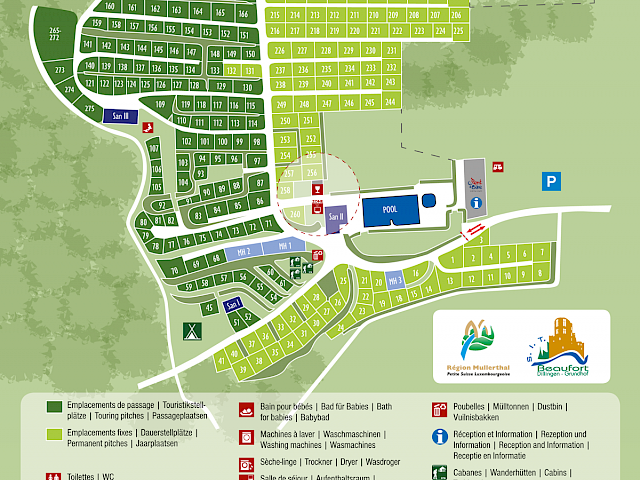 Der Camping Park Beaufort befindet sich im Herzen der Kleinen Luxemburger Schweiz. Alle Stellplätze befinden sich am Waldrand auf sogenannten Terrassen. Um die Ecke liegt die bekannte Ruine Château de Beaufort.