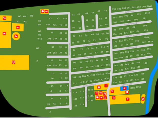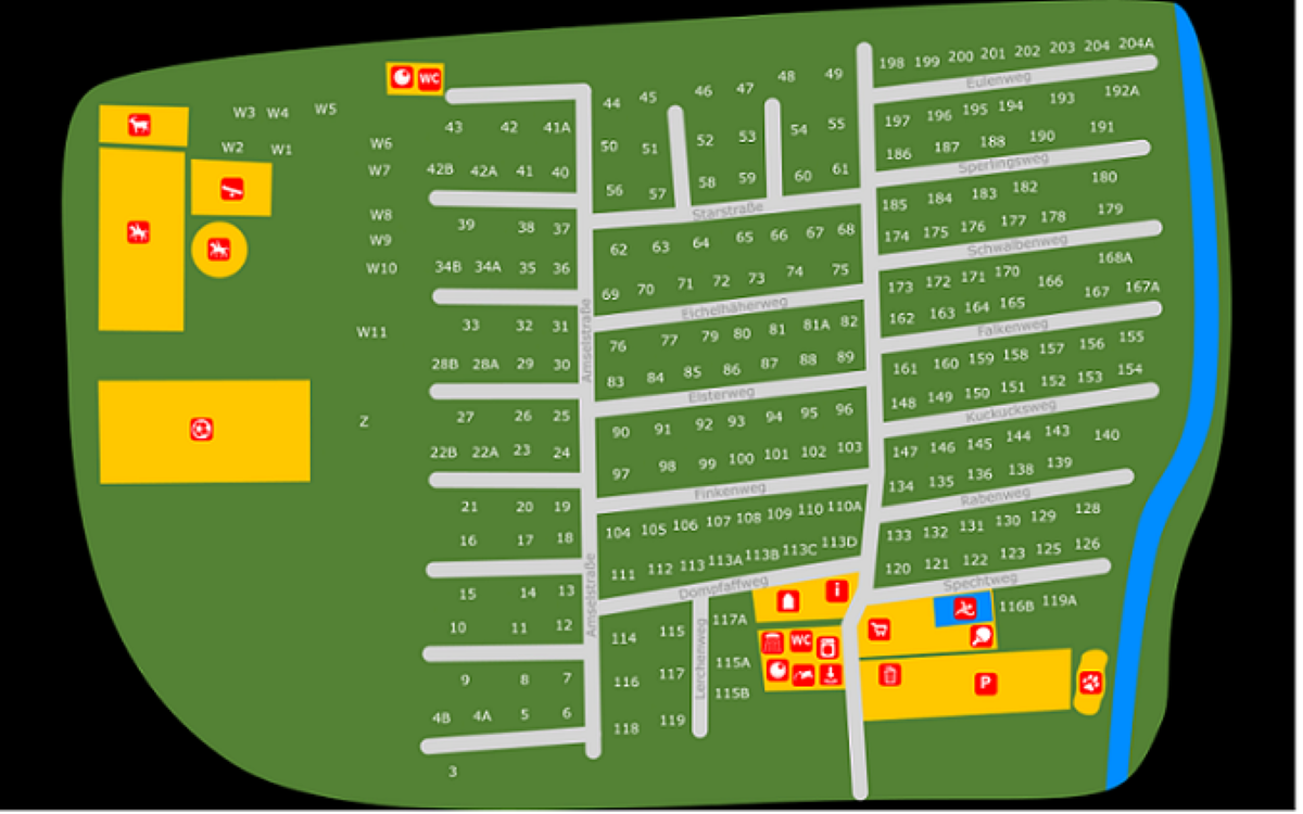 Der Campingplatz verfügt über viele Einrichtungen wie einen Kiosk, ein eigenes Freibad, einen Aufenthaltsraum, einen Streichelzoo und viele weitere Freizeitmöglichkeiten. Außerdem gibt es eine aktive Reitschule mit Pferden.